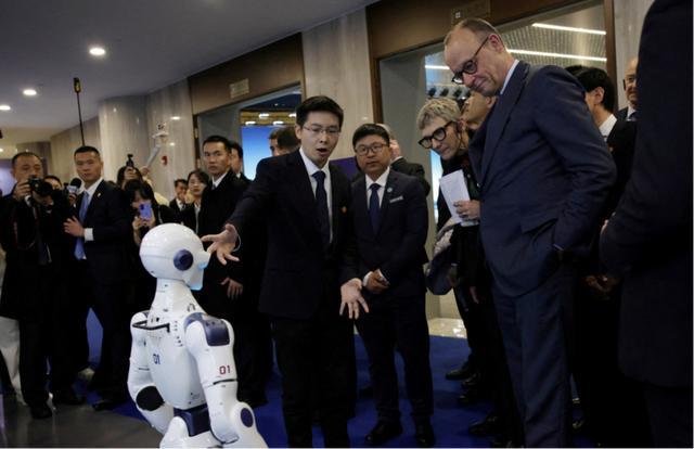 在这里默茨参观了机器人行业的领头羊——宇树科技。德国虽然是制造业强国,但是人工智能、机器人方面却并不处于行业的领先地位。这一点能够通过数据得到直观的体现,在2023年全球和AI相关的5.4万项专利中,中国占有3.8万项位居全球第一,美国6000项,而德国仅有708项排名全球第七。所以有不少媒体调侃称,这次默茨前往杭州,是“见世面”去了。